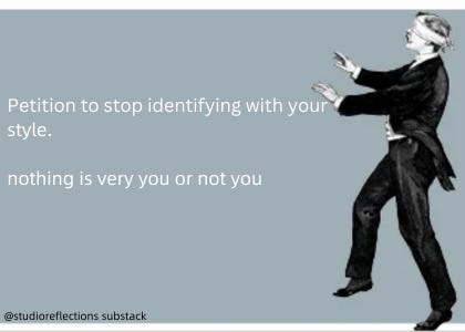 studio reflections is a monthly dispatch of observations from the fitting room of barostudio___. It’s a log of my learnings where I resist the optimised pull of algorithms and document my process in long form. I choose this space to unpack the politics of visual communication via relevant texts, theory, imagery and conversation. I consider dialogue to be my social currency with this project so if you find yourself having opinions about what you read here, I would like to engage with you in the comments or email. If you identify too much with your style or your visual, external self— I wish to humour you with this essay. It’s a reminder to myself, and by extension you; that you are not how you dress or what aesthetic preferences you align with. It’s a raw, (probably) improperly punctuated account of how I talked myself out of my head.